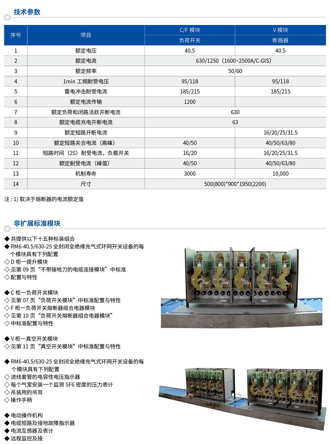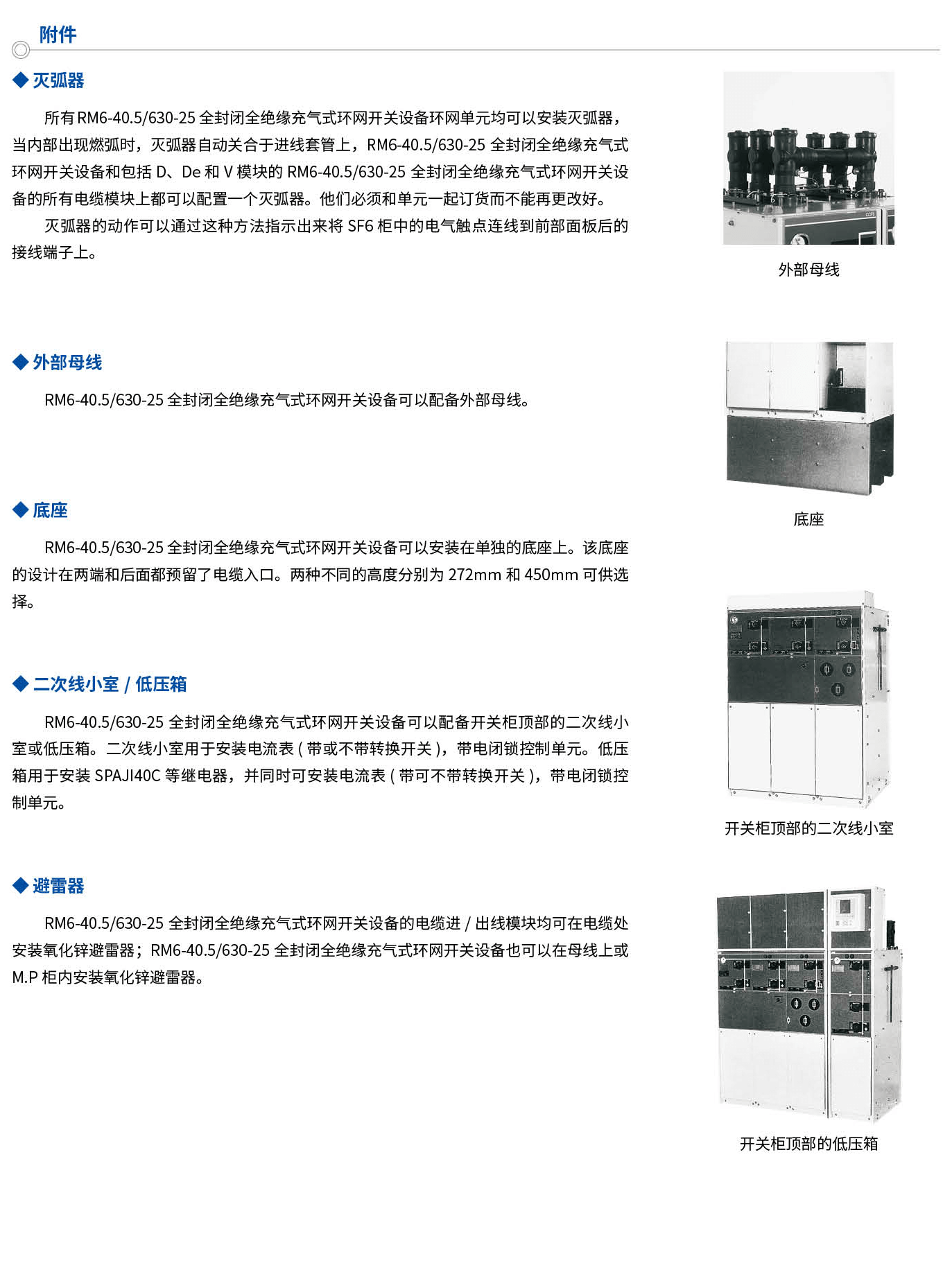 RM6-40.5/630-25全封闭全绝缘充气式环网开关设备,广泛用于35kV/24kV配电系统,是城乡各类用户变配电系统的首选开关产品。开关柜为模块化单元模式,可根据不同用途进行组合:由固定式单元组合与可扩展型单元两大类,满足各种变电站对紧凑型开关柜灵活使用的需要。